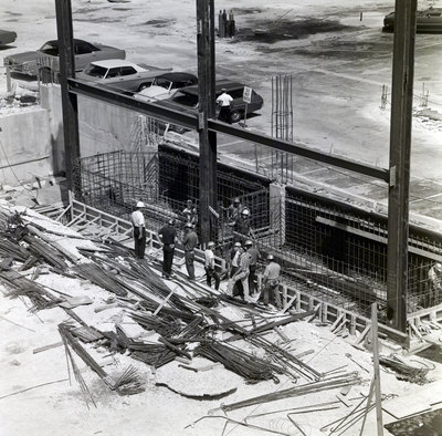 A construction site for First National Bank of Miami in Miami, Florida. Photographed for Florida Steel Corporation.
