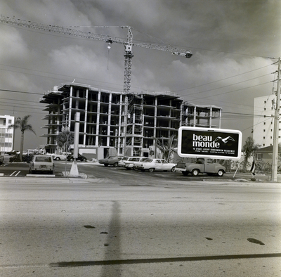 Gandy, George Skip IV, "Florida Steel Construction Site for Beau Monde Luxury Condominiums, AA" (1971). Gandy Photographs - Streets, Buildings, and Construction. Image 3187.