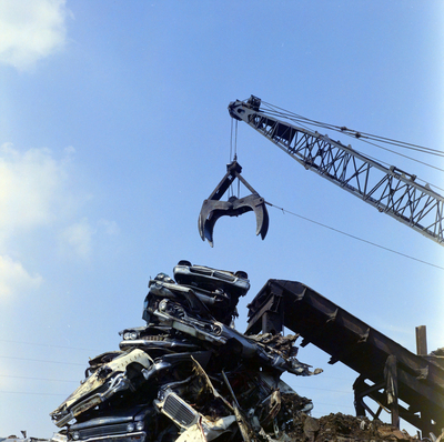 A scrapped car is added to a stack of other salvaged cars at Florida Steel Corporation circa 1974. Photographed for Jeanne Moorehead advertising firm.