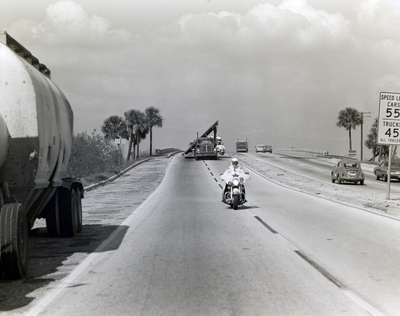 Gandy, George Skip IV, "Sheriff on Motorcycle Escorts Florida Steel Trailer, F" (1975). Gandy Photographs - Streets, Buildings, and Construction. Image 3538.