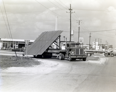 A deputy from the Hillsborough County Sheriff's Office escorts a large Florida Steel Corporation truck and trailer to a construction site via motorcycle circa 1975.