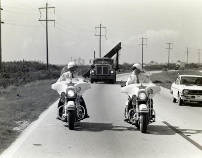 Gandy, George Skip IV, "Sheriff on Motorcycle Escorts Florida Steel Trailer, P" (1975). Gandy Photographs - Streets, Buildings, and Construction. Image 3546.