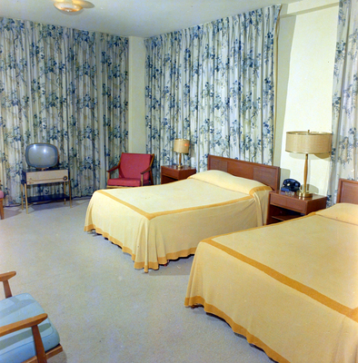 A view of the inside of a hotel room at Hotel Floridan at 905 North Florida Avenue in Tampa, Florida, circa 1970s.