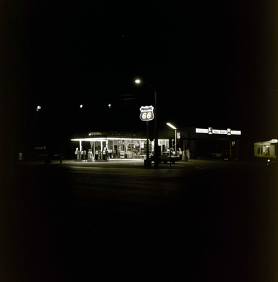 A Phillips 66 gas station has lighting installed by Fluorescent Service Corporation. The building is located at the corner of 5th Avenue and U.S. 19 in St. Petersburg, Florida, circa 1960s.