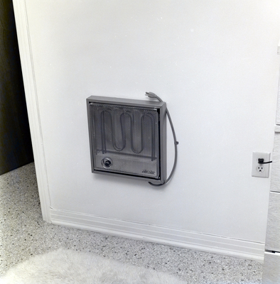 Apartment interior. An unplugged radiant heater is installed on the wall. A fur rug is on the floor.