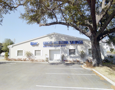 Exterior of a one-story Great Western Savings building with signage for real estate services. A large tree provides shade over the parking lot in front of the entrance.