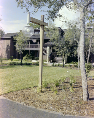 The Hughes apartment building features a wooden structure with a stone entrance and a round light suspended at the entryway.