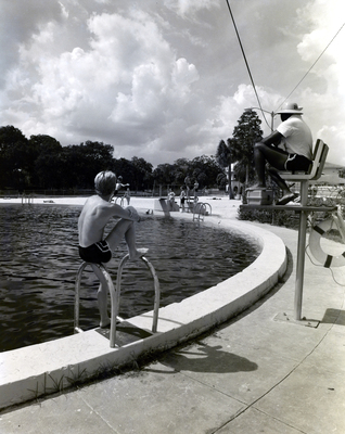 Old Sulphur Springs pool with child resting on ladder and lifeguard watching pool. The Old Sulphur Springs pool was part of Sulphur Springs Park, a tourist attraction referred to as "Florida's Coney Island," originally built in the 1920s and closed in 1986 and featured a natural spring-fed pool. Taken as part of Horizon 2000, a project adopted by local government to address concerns of growth management by the year 2000.