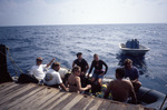 A group of seven researchers sit on a dinghy docked near a wooden deck. This photograph was taken during Leg I of a Keyswide expedition conducted in August 1995.