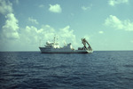 A white ship that reads “Harbor Branch Oceanographic R/V Seward Johnson” is anchored in the open ocean.