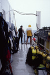 Two researchers stand near the railing of a research vessel and a storage area of oxygen tanks is visible in the foreground. This photograph was taken in the Floria Keys during Leg II of a Keyswide coral reef expedition.