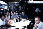 Rich Aronson, Tracy Baynes, Emre Turak, Peter Glynn and Bob Ginsburg dining outdoors in Miami, Florida. This photograph was taken during Leg 3 of a Keyswide coral reef expedition.