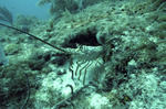 A lobster sticks its head and body out from a coral and rock structure covered in dictyota. This photograph was taken at Triumph Reef during Leg I of a Keyswide expedition on August 19, 1995.