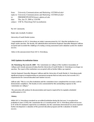 An email from Judy Genshaft to the President List Listserv about the University of South Florida St. Petersburg received full accreditation from the Southern Association of Colleges and Schools.