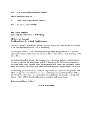 Email, Judy Genshaft to University of South Florida St. Petersburg Community, Appointment of Margaret Sullivan, December 11, 2009
