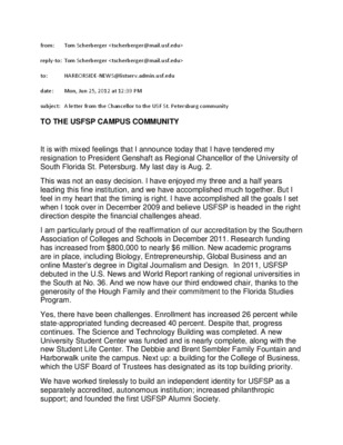 Email from President of the University of South Florida St. Petersburg announcing the resignation of Regional Chancellor Karen White who would take a different position at USF.