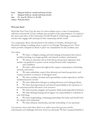 Email, Margaret Sullivan to University of South Florida St. Petersburg Community, Welcome Back, August 20, 2010