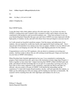 Email, Bill Hogarth to University of South Florida St. Petersburg Family, May 3, 2013