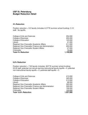 A summary of the reductions by departments or areas within the University of South Florida St. Petersburg if a 4% or 6.6% budget reduction were to happen.