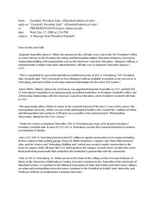 Email, Karen White to USF St. Petersburg Community, USF: A Multi-Campus System for the Future of Our Region, March 27, 2008