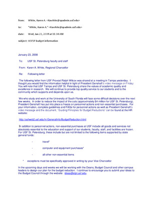 Email, Karen White to USF St. Petersburg Faculty and Staff, USF St. Petersburg Budget Information, January 23, 2008