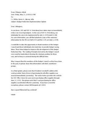 Email, Ashok Dhingra to USF St. Petersburg Faculty and Staff, Budget Reduction Implementation Update, May 23, 2008