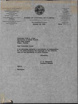 Correspondence and attached concept for the University of South Florida Botanical Gardens, as conceived by Director Frederick B. Essig. Topics include facilities, environmental education, campus partnerships, educational outreach, design, recreation, and landscaping.
